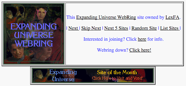 Expanding Universe WebRing ← Previous Next → Expanding Universe WebRing This one’s a bit more grandiose in design, but we forgive it much for Delenn being right up there at the top.